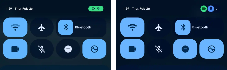 3. إعادة تصميم مؤشرات الخصوصية: شهدت مؤشرات الخصوصية تحسينات طفيفة في التصميم، في السابق، كانت تظهر رموز الكاميرا والميكروفون والموقع داخل إطار أخضر بشكل كبسولة في أعلى يمين الشاشة عند استخدامها. أما الآن، فباتت تظهر داخل دوائر منفصلة، مع تغيير لون مؤشر الموقع إلى الأزرق بدلا من الأخضر.