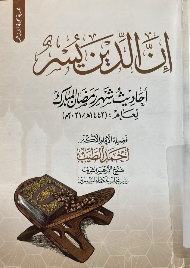 ويضم كتاب «إن الدين يسر» أحاديث شهر رمضان لعام 1442هـ/2021م، التي ألقاها فضيلة الإمام الأكبر أحمد الطيب، شيخ الأزهر الشريف، عبر عدد من القنوات الفضائية. ويدور الكتاب حول محور جامع هو سماحة الإسلام ويُسر شريعته ورفض منهج التشدد والاهتمام بالمظاهر على حساب المقاصد ويدعو إلى فهم النصوص في ضوء غاياتها العليا، كما يشجع على التجديد الواعي في الفكر الإسلامي والانفتاح على تنوع التراث الفقهي والمحبة بين الشعوب.