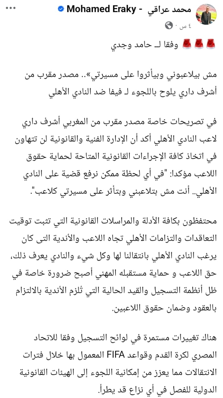 وكتب الناقد الرياضي محمد عراقي عبر حسابه على فيسبوك، نقلًا عن مصدر مقرب من اللاعب المغربي أشرف داري، أن الإدارة الفنية والقانونية لن تتهاون في اتخاذ جميع الإجراءات القانونية المتاحة للحفاظ على حقوق اللاعب، مؤكدًا: "في أي لحظة ممكن نرفع قضية على النادي الأهلي.. أنت مش بتلاعبني وبتأثر على مسيرتي كلاعب".