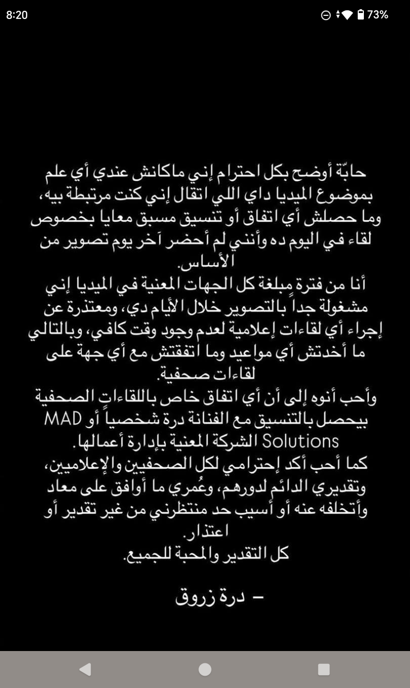 وأضافت : أحب أنوه إلى أن أي اتفاق خاص باللقاءات الصحفية بيحصل بالتنسيق مع الفنانة درة شخصيا أو MAD Solutions الشركة المعنية بإدارة أعمالها وأؤكد إحترامي لكل الصحفيين والإعلاميين وتقديري الدائم لدورهم ، وعُمري ما أوافق على معاد وأتخلفه عنه أو أسيب حد منتظرني من غير تقدير أو اعتذار.