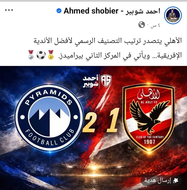 وكتب الإعلامي أحمد شوبير عبر حسابه على فيسبوك “الأهلي يتصدر ترتيب التصنيف الرسمي لأفضل الأندية الإفريقية.. ويأتي في المركز الثاني بيراميدز”.