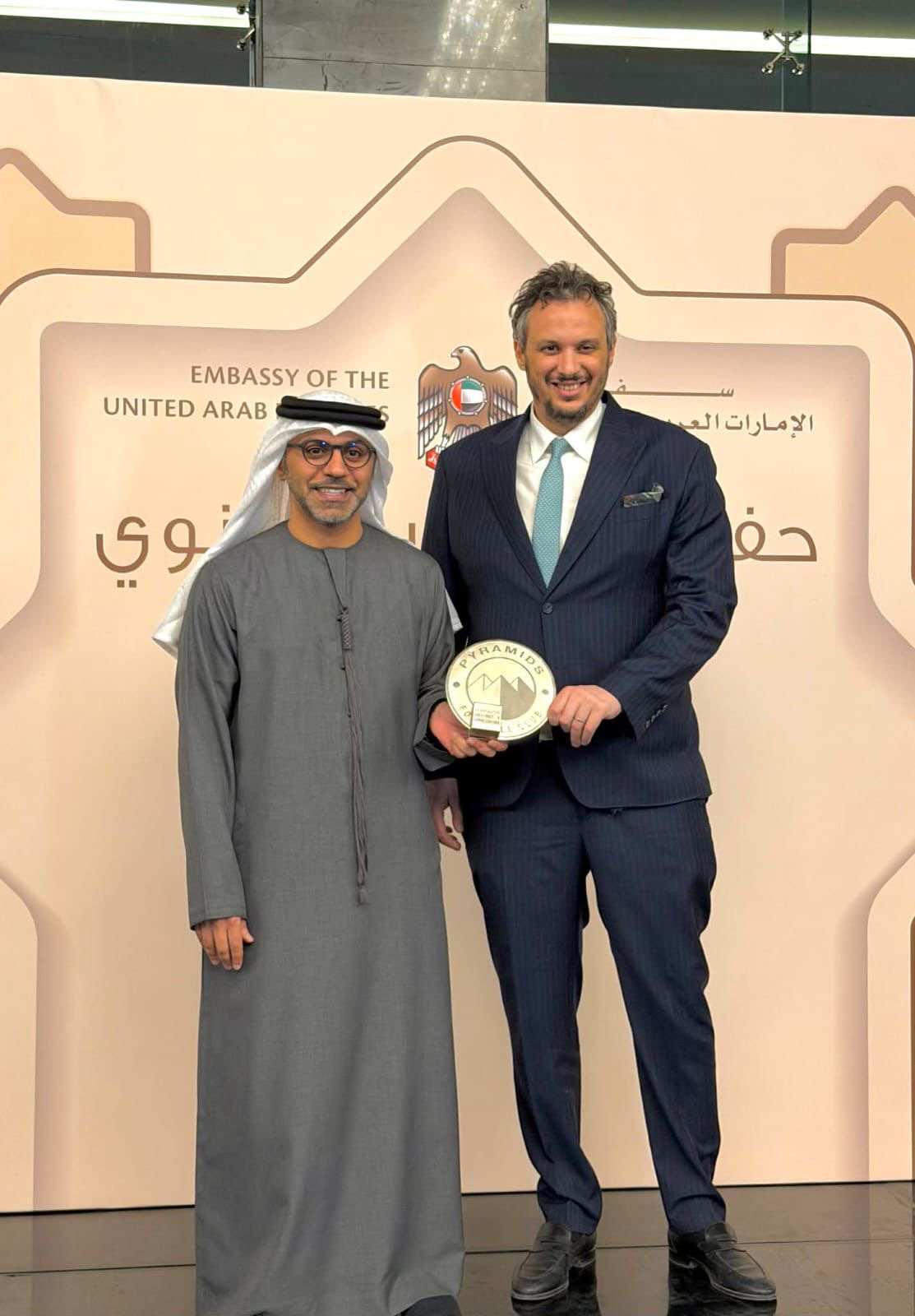 وحرص المهندس ممدوح عيد على إهداء درع نادي بيراميدز لسفير الإمارات موجها الشكر للسفارة وكامل طاقهما على الدعم المستمر للنادي والحرص على التواجد الدائم خلفه في كل البطولات التي تحققت خلال السنوات الماضية.