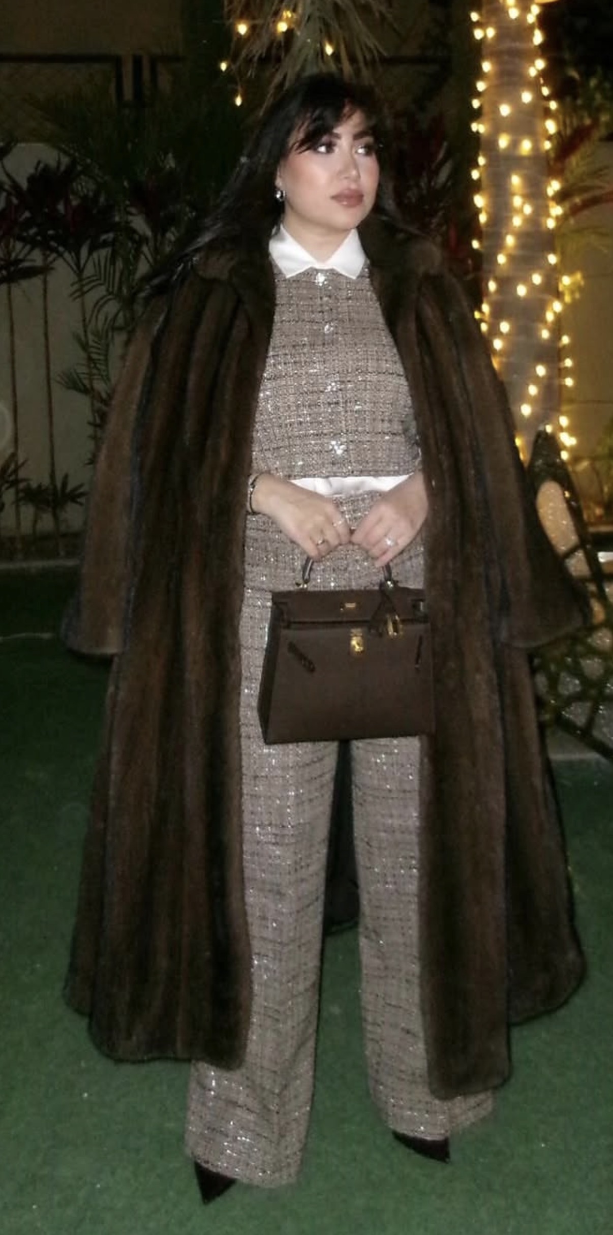 أكملت بوسي إطلالتها بـ بالطو باللون البني، مع حقيبة يد متوسطة الحجم بنفس اللون وانتعلت حذاء أنيق ذا كعب عالي أنيق.