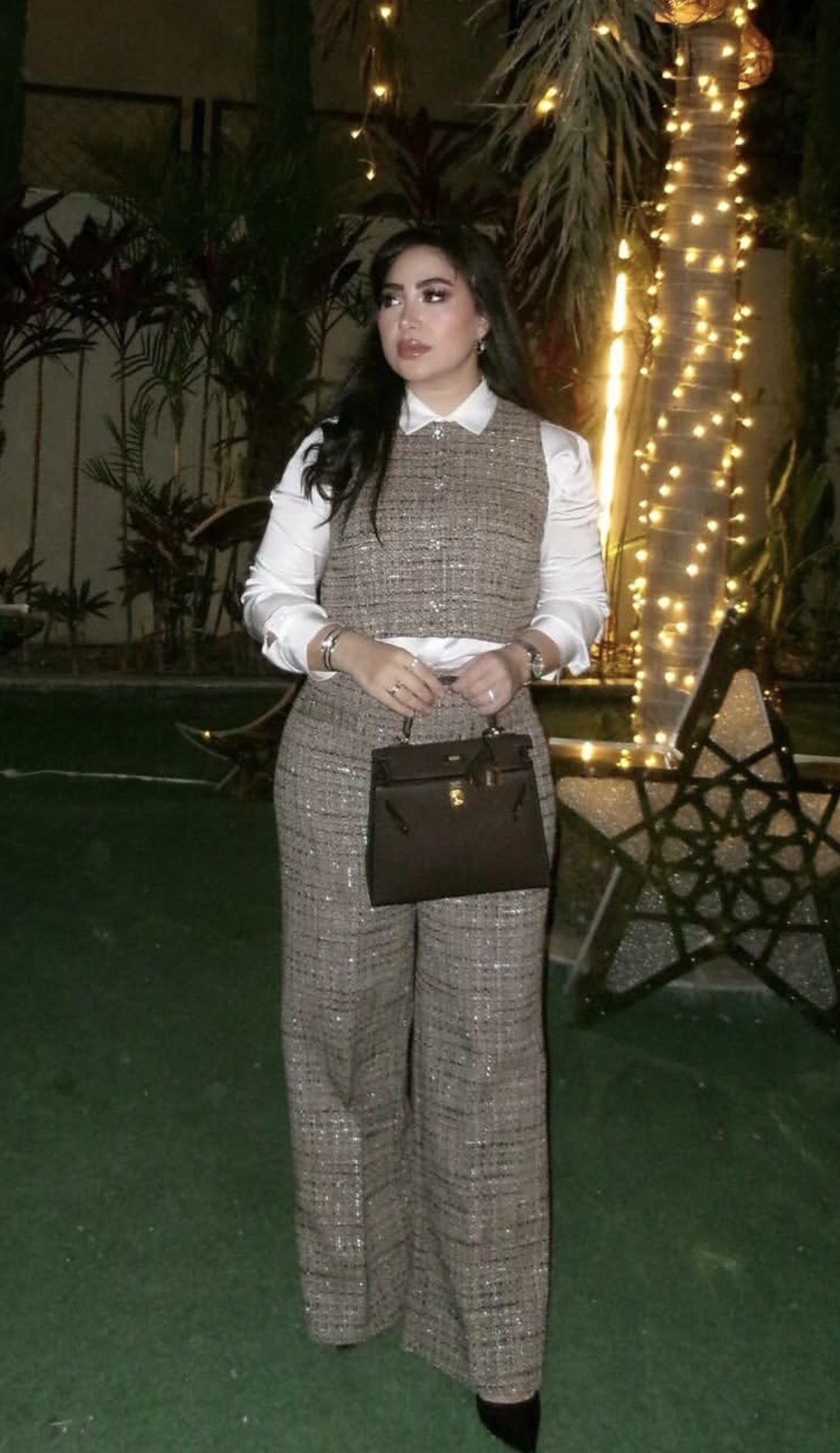 تألقت بوسي في الصور بإطلالة راقية، حيث ظهرت مرتدية بنطلون كاروهات باللون البني مع ڤيست بنفس اللون ونسقت معهما قميص أبيض.