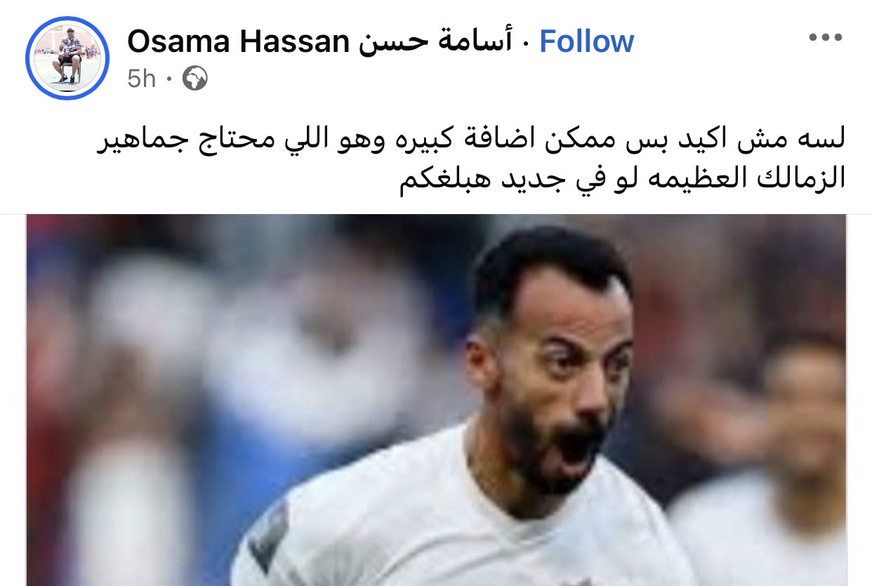 ونشر أسامة حسن لاعب الزمالك السابق عبر حسابه علي فيسبوك صورة لـ أحمد عبد القادر وكتب "لسه مش اكيد بس ممكن اضافة كبيره وهو اللي محتاج جماهير الزمالك العظيمة لو في جديد هبلغكم"