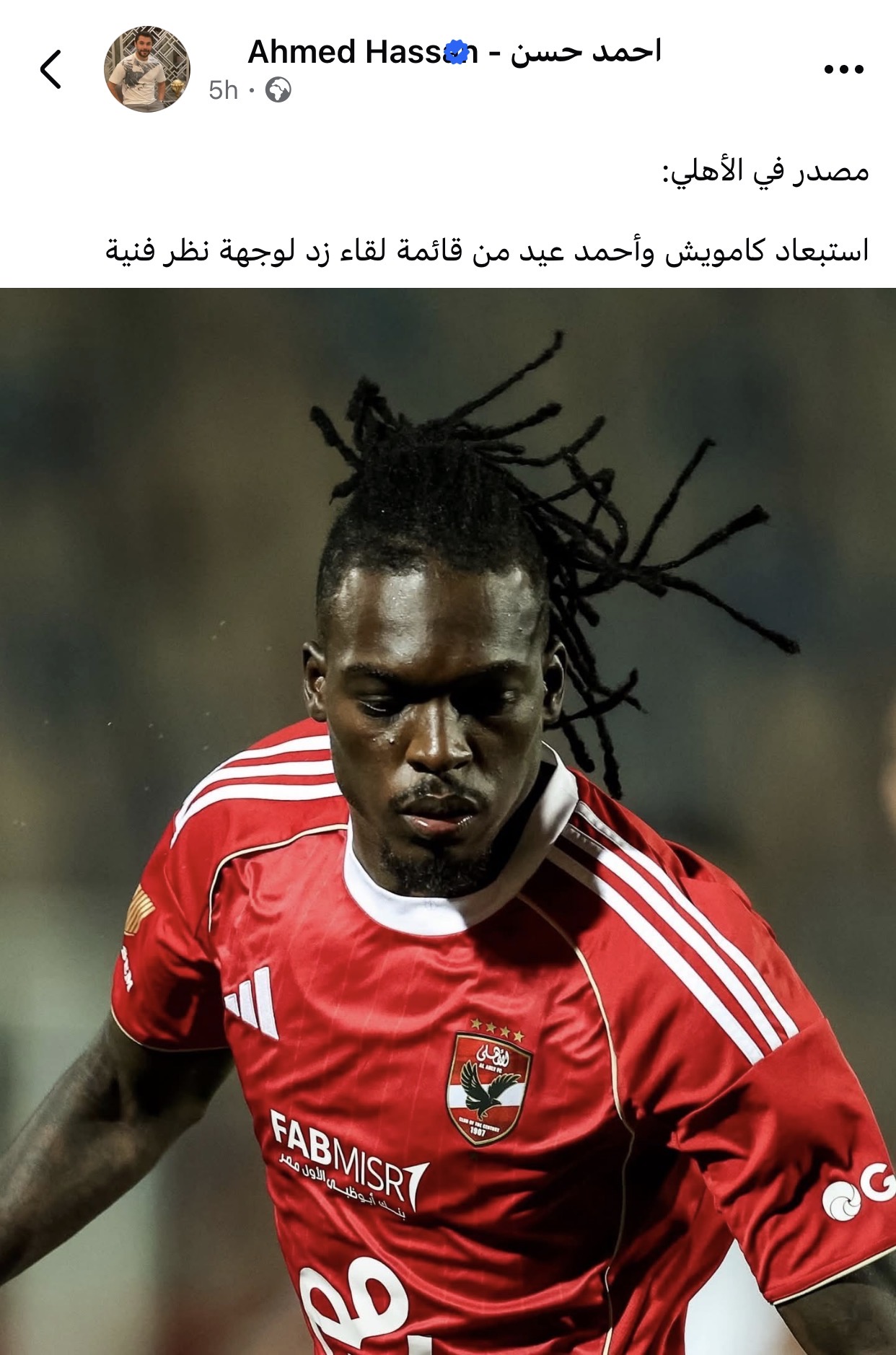 وكتب أحمد حسن عبر حسابه علي فيسبوك "مصدر في الأهلي:استبعاد كامويش وأحمد عيد من قائمة لقاء زد لوجهة نظر فنية"