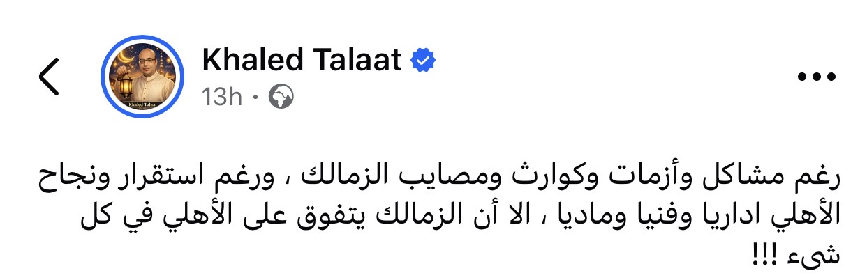 وكتب الناقد الرياضي خالد طلعت عبر حسابه علي فيسبوك: "رغم مشاكل وأزمات وكوارث ومصايب الزمالك ، ورغم استقرار ونجاح الأهلي اداريا وفنيا وماديا ، الا أن الزمالك يتفوق على الأهلي في كل شىء"