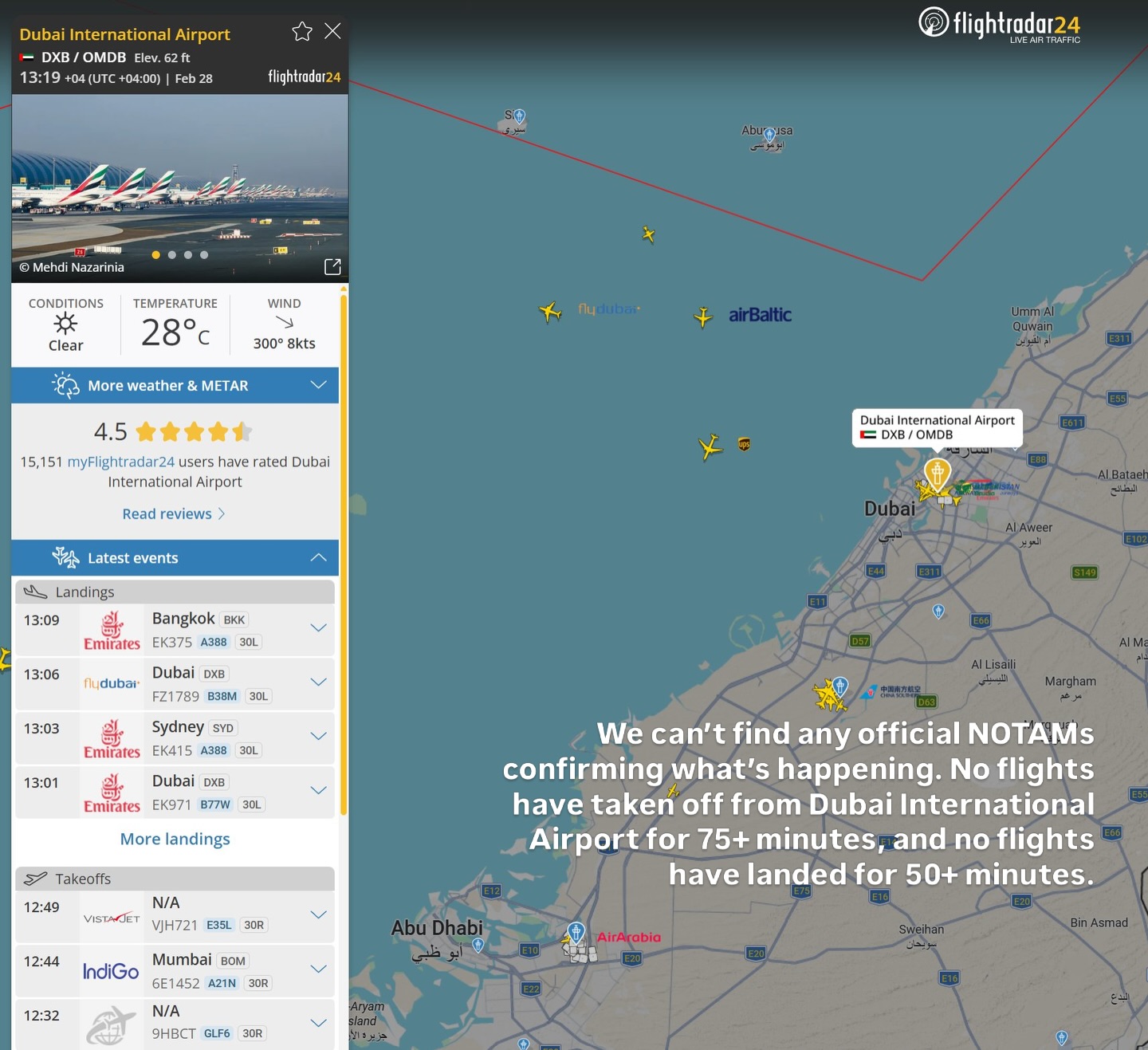 رصد موقع تتبع الرحلات العالمي «فلايت رادار 24» حالة من الارتباك الملحوظ في انتظام حركة الملاحة الجوية بمطار دبي الدولي (DXB)، في ظل التصعيد العسكري الذي تشهده المنطقة وإغلاق عدد من المجالات الجوية المجاورة.