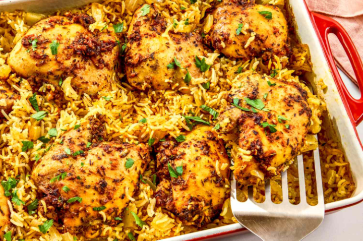 ـ يُنقل الأرز إلى صينية فرن، ويُرص فوقه الدجاج المتبل.