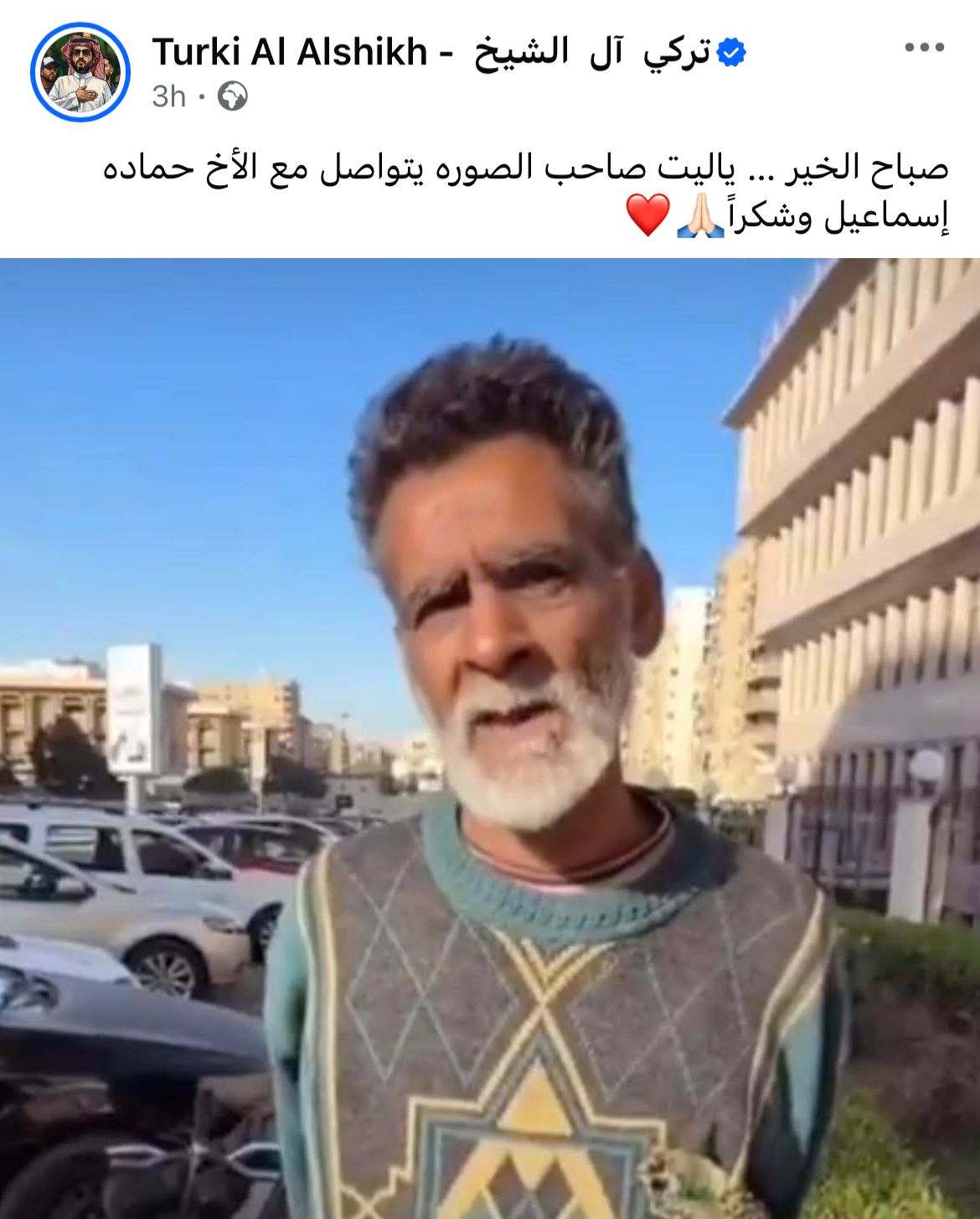 وكتب تركي آل الشيخ عبر حسابه على “فيسبوك”: “يا ليت صاحب الصورة يتواصل مع الأخ حمادة إسماعيل وشكراً”.