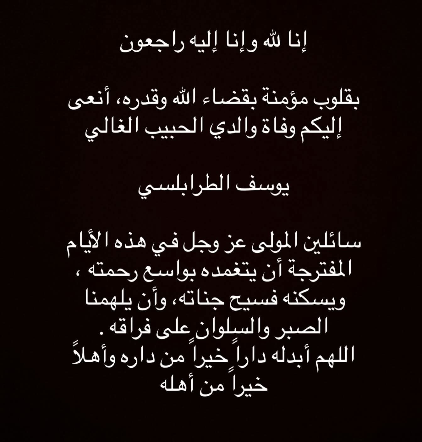 وتابعت:"رحل الجسد وبقيت الذكرى الطيبة والدعاء الذي لا ينقطع نسأل الله أن يتغمده بواسع رحمته وأن يسكنه فسيح جناته وأن يجمعنا به في الفردوس الأعلى، يقام العزاء يوم الجمعة الموافق ۲۷ فبراير ۲۰۲٦ ، عقب صلاة العشاء بمسجد الشرطة بالشيخ زايد، برجاء الدعاء له بالرحمة والمغفرة، ولنا جميعًا بالصبر والسلوان، البقاء لله وحده".