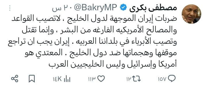 وكتب بكري عبر حسابه الرسمي على منصة إكس"ضربات إيران الموجهة لدول الخليج ، لاتصيب القواعد والمصالح الأمريكيه الفارغه من البشر ، وإنما تقتل وتصيب الأبرياء في بلداننا العربيه . إيران يجب ان تراجع موقفها وهجماتها ضد دول الخليج المعتدي هو أمريكا وإسرائيل وليس الخليجيين العرب.