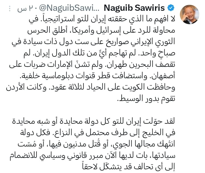 وقال ساويرس عبر حسابه الرسمي على منصة إكس" إن الحرس الثوري الإيراني أطلق صواريخ على ست دول ذات سيادة في صباح واحد، رغم أن أياً منها لم يهاجم إيران أو يشارك في عمليات عسكرية ضدها.