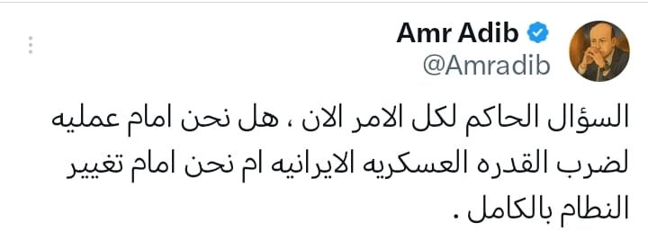 وقال أديب فى تغريدة له عبر حسابه علي اكس "السؤال الحاكم لكل الأمر الآن ، هل نحن أمام عملية لضرب القدرة العسكرية الإيرانيه أم نحن أمام تغيير النطام بالكامل"