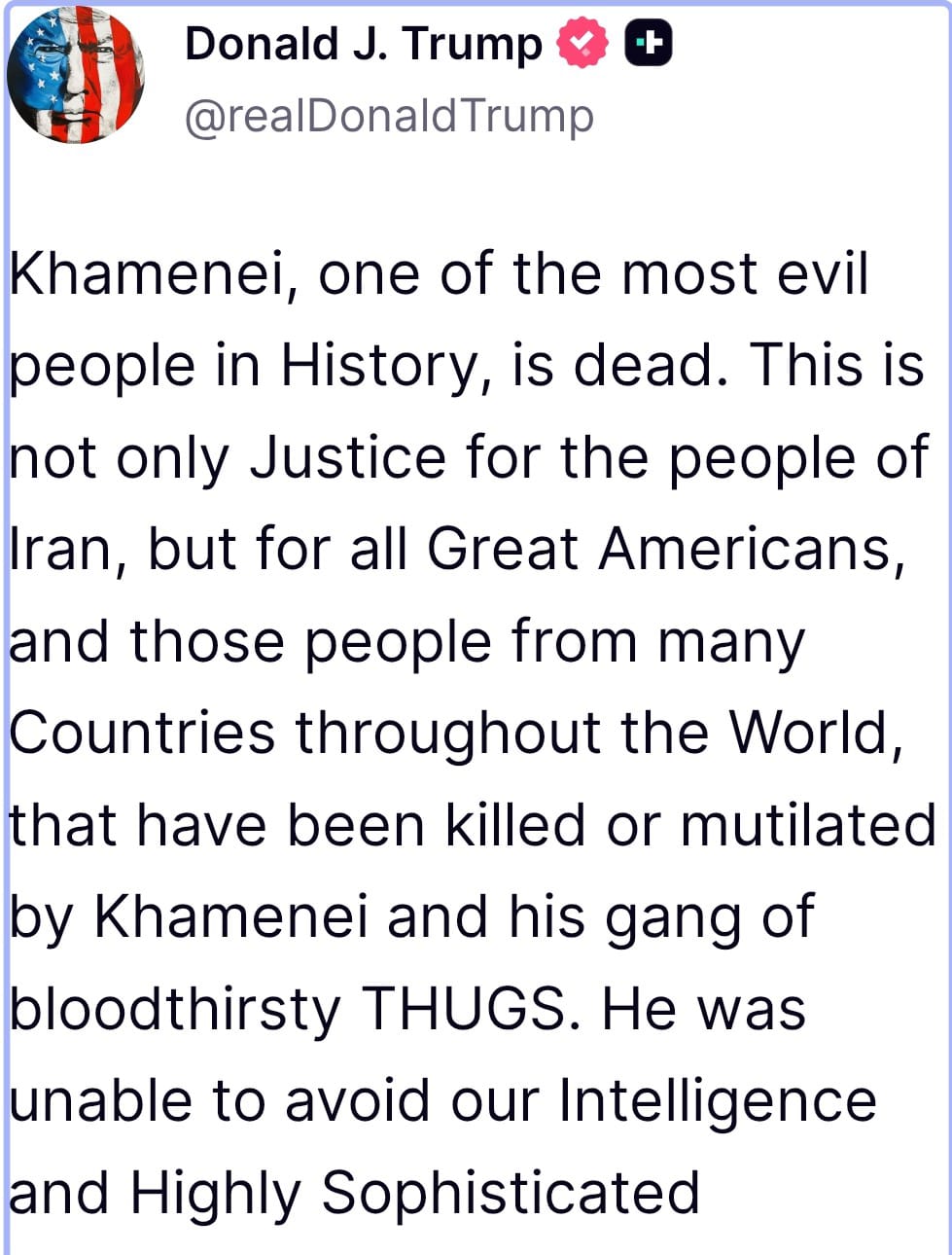 أعلن الرئيس الأمريكي دونالد ترامب، مقتل المرشد الإيراني على خامنئي، واصفاً إياه بأنه "أحد أكثر الأشخاص شراً في التاريخ".