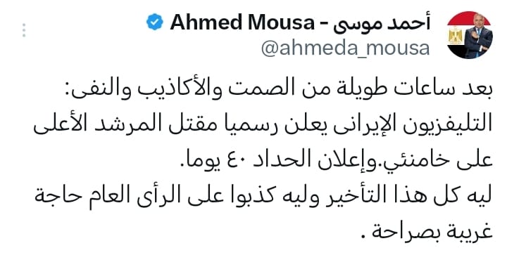"بعد ساعات طويلة من الصمت والأكاذيب والنفي، التلفزيون الإيراني يعلن رسميًا مقتل المرشد الأعلى علي خامنئي، وإعلان الحداد 40 يومًا. ليه كل هذا التأخير؟ وليه كذبوا على الرأي العام؟ شيء غريب بصراحة."