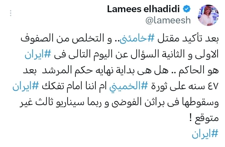 وكتبت الإعلامية لميس الحديدي في تغريدة لها عبر حسابها على إكس: «بعد تأكيد مقتل خامنئي، والتخلص من الصفوف الأولى والثانية، السؤال عن اليوم التالي في إيران: من الحاكم؟ هل هي بداية نهاية حكم المرشد بعد 47 سنة على ثورة الخميني، أم أننا أمام تفكك إيران وسقوطها في براثن الفوضى، وربما سيناريو ثالث غير متوقع».