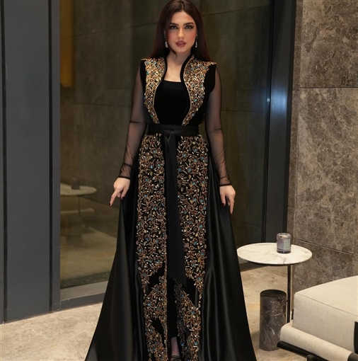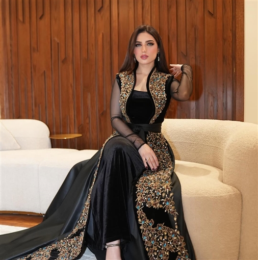 القفطان تميز بتطريز يدوي دقيق زيّن الأطراف والظهر، حيث جاءت النقوش بألوان متناغمة أضفت عمقًا بصريًا مميزًا على الإطلالة، دون مبالغة أو ازدحام في التفاصيل.