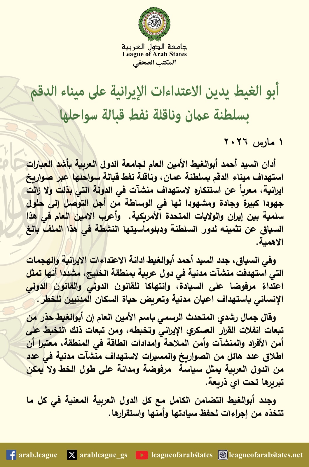 أدان أحمد أبوالغيط، الأمين العام لجامعة الدول العربية، بأشد العبارات استهداف ميناء الدقم بسلطنة عمان، وناقلة نفط قبالة سواحلها عبر صواريخ إيرانية، معربًا عن استنكاره لاستهداف منشآت في الدولة التي بذلت ولا تزال جهودًا كبيرة وجادة ومشهودة لها في الوساطة من أجل التوصل إلى حلول سلمية بين إيران والولايات المتحدة الأمريكية.