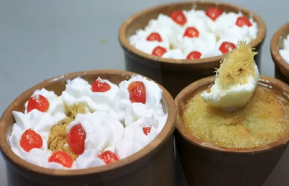 يقدم مع الكنافة المحمرة والقشطة والكريم شانتي وكريز الحلويات .