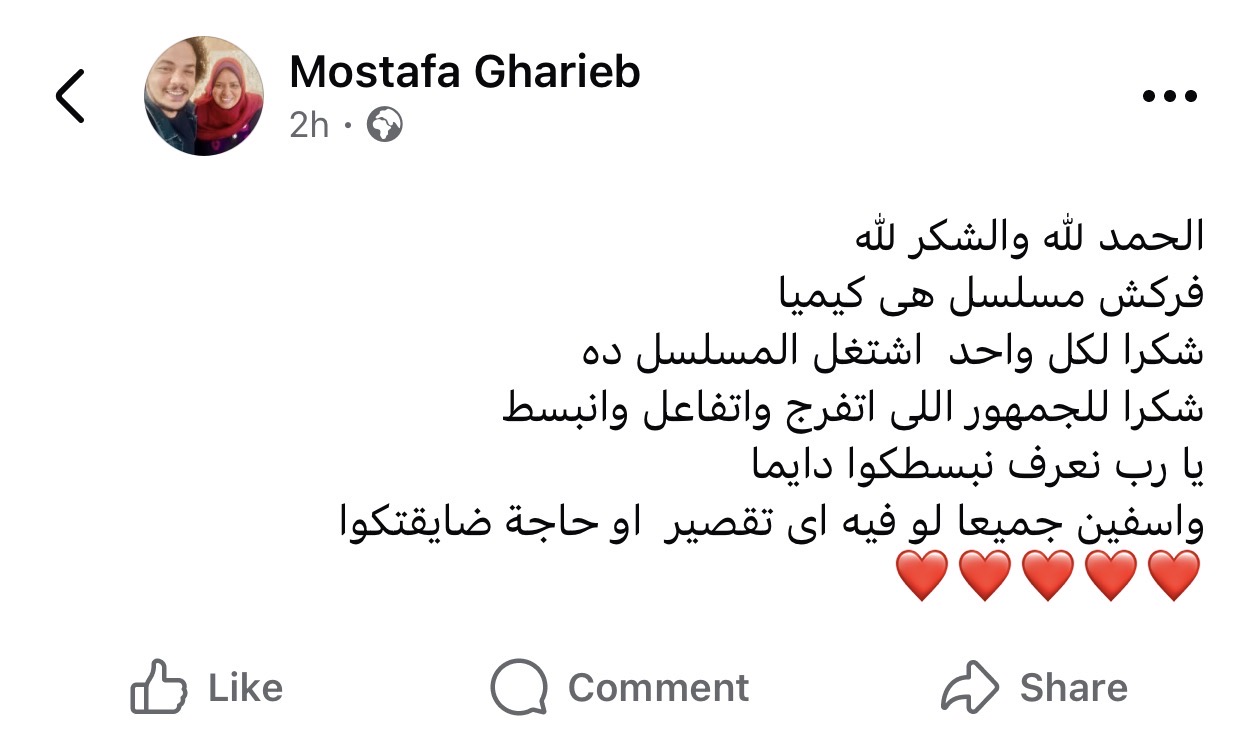 وكتب مصطفى غريب: “الحمد لله والشكر لله.. فركش مسلسل هي كيميا.. شكراً لكل واحد اشتغل في المسلسل ده، شكراً للجمهور اللي اتفرج واتفاعل وانبسط، يارب نعرف نبسطكوا دايماً.. وآسفين جميعاً لو فيه أي تقصير أو حاجة ضايقتكوا”