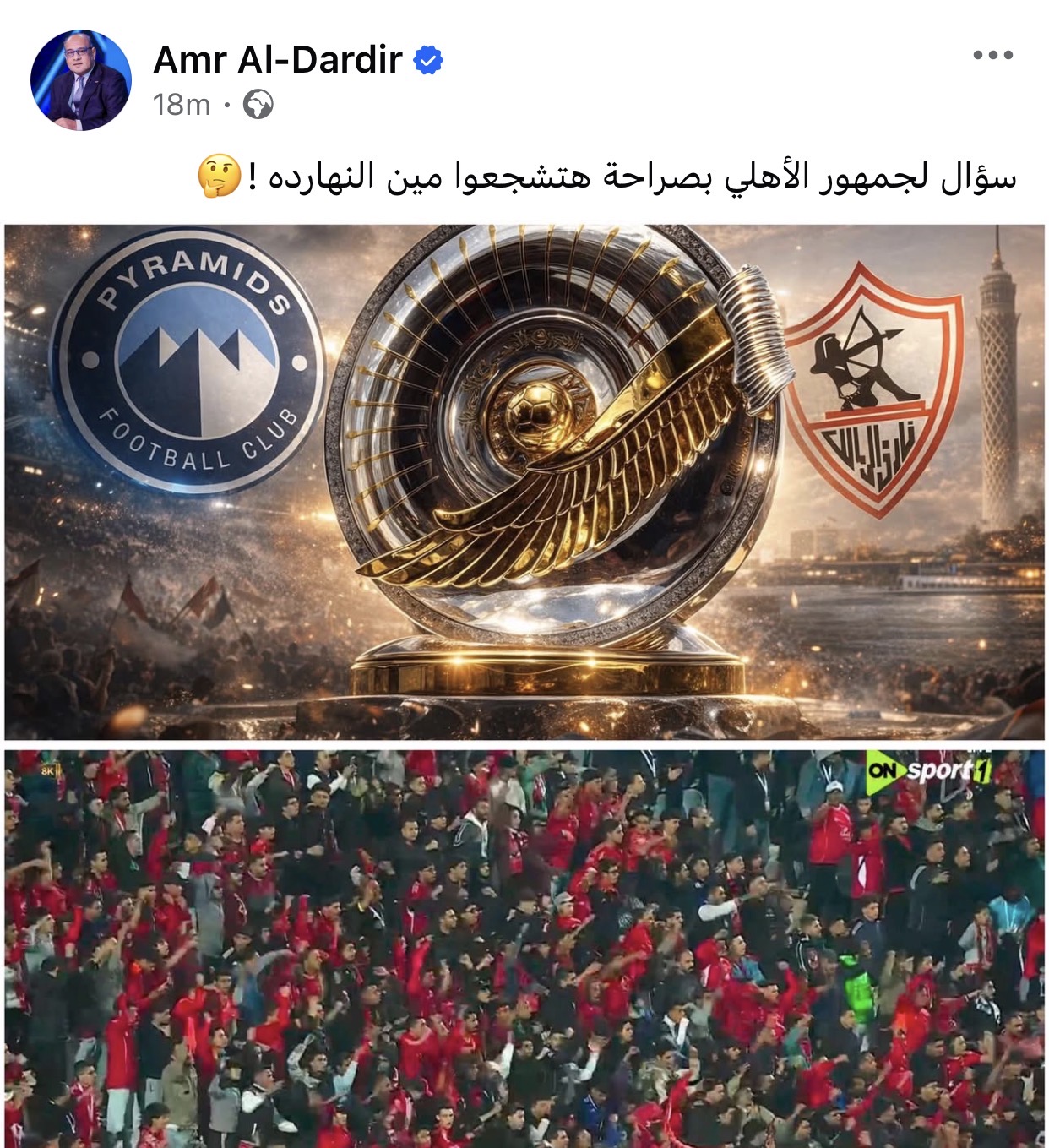 وكتب عمرو الدردير عبر حسابه علي موقع التواصل الاجتماعي فيسبوك: "سؤال لجمهور الأهلي بصراحة هتشجعوا مين النهاردة".