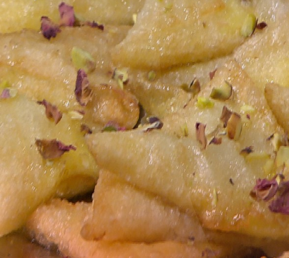 يسقى بالشربات ويزين بالشوكولاته ويقدم.