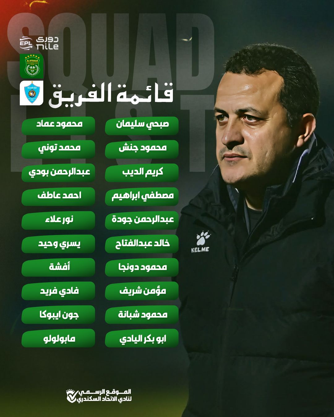 أعلن تامر مصطفي المدير الفني للفريق الأول لكرة القدم بنادي الاتحاد السكندري قائمه فريقه استعدادا لمواجهة غزل المحلة غدا في إطار مباريات الاسبوع العشرون لمسابقة الدوري الممتاز موسم 2025– 2026