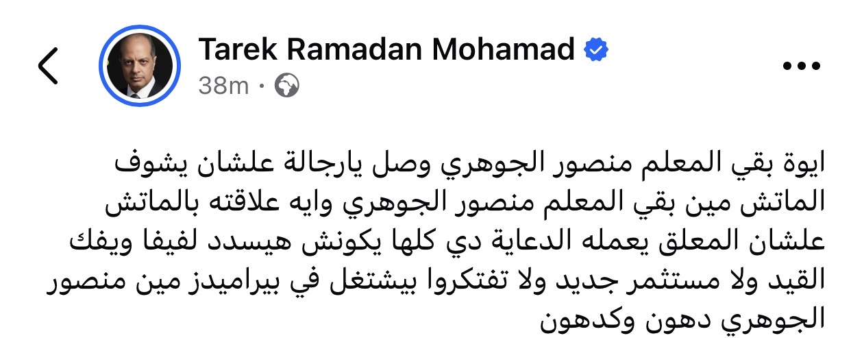 وكتب رمضان بأسلوب ساخر: “ايوة بقي المعلم منصور الجوهري وصل يارجالة علشان يشوف الماتش مين بقي المعلم منصور الجوهري وايه علاقته بالماتش علشان المعلق يعمله الدعاية دي كلها يكونش هيسدد لفيفا ويفك القيد ولا مستثمر جديد ولا تفتكروا بيشتغل في بيراميدز مين منصور الجوهري دهون وكدهون”.