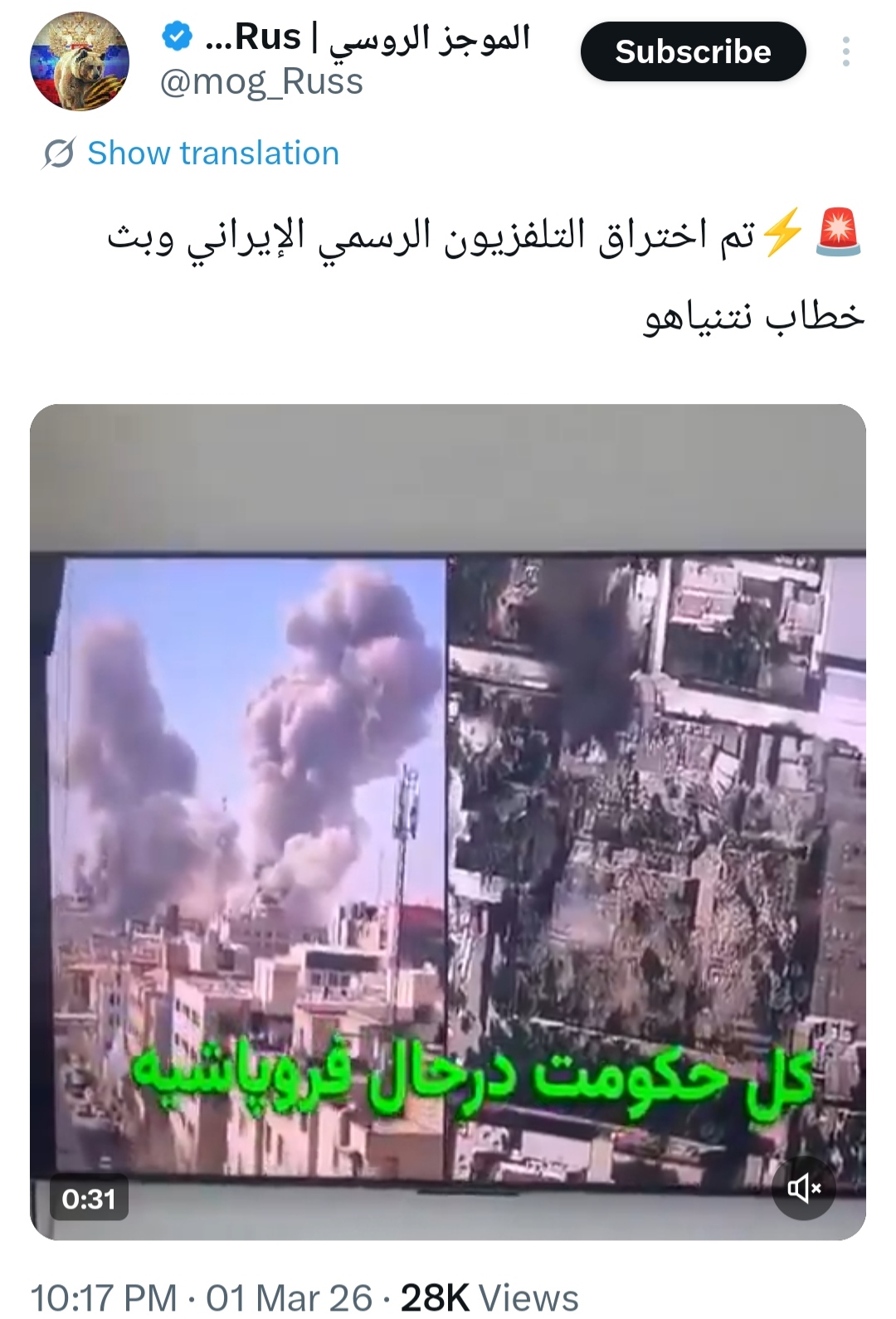 تعرضت هيئة الإذاعة والتلفزيون الإيرانية، الناقل الرسمي للدولة، لاختراق، ثم تم عرض خطاب رئيس الوزراء الإسرائيلي بنيامين نتنياهو الذي خاطب الشعب الإيراني باللغة الفارسية.