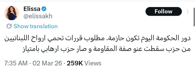 وكتبت إليسا عبر حسابها علي موقع التواصل الاجتماعي X: "دور الحكومة اليوم تكون حازمة، مطلوب قررات تحمي أرواح اللبنانيين من حزب سقطت عنه صفة المقاومة وصار حزب إرهابي بإمتياز".