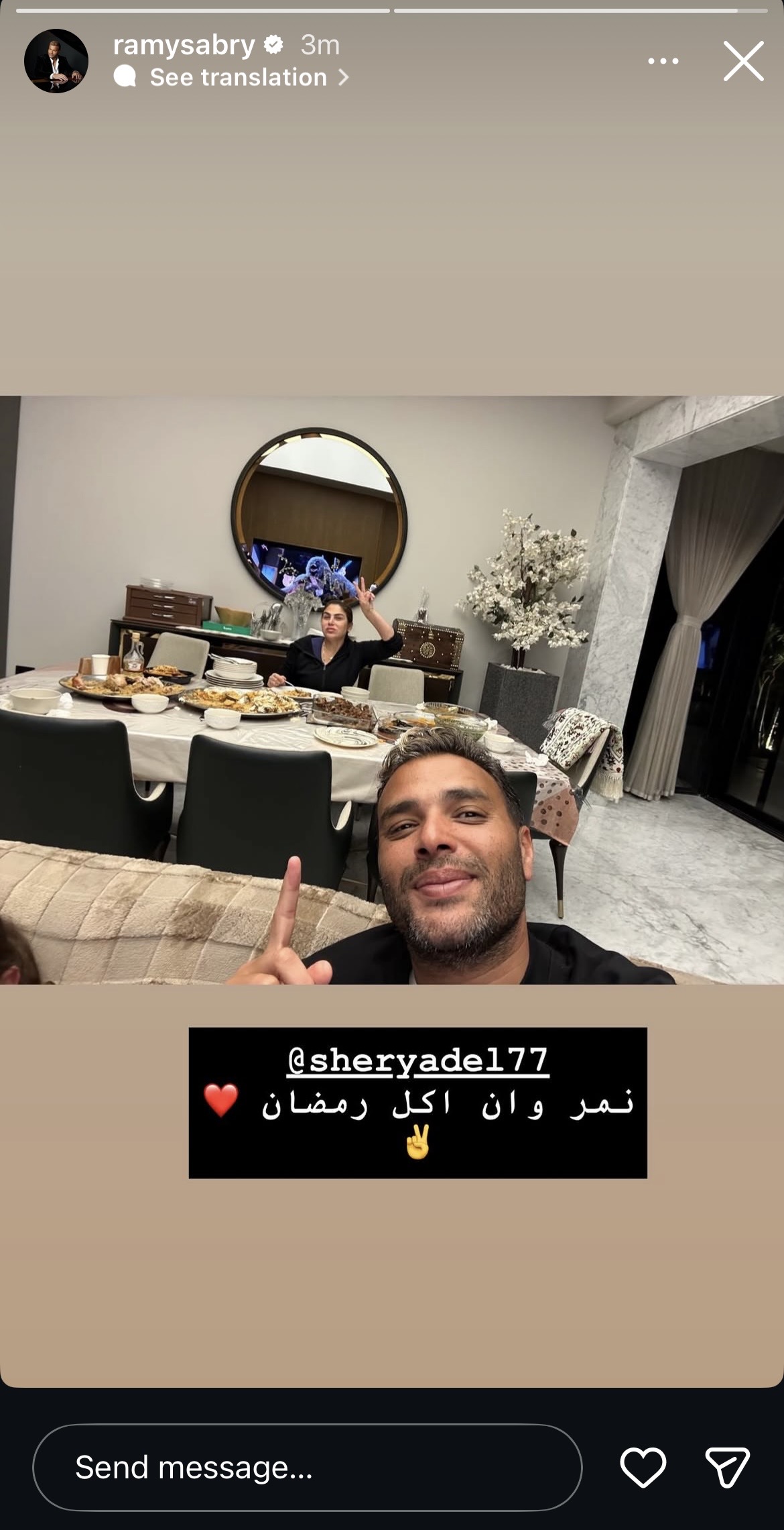 وكتب رامي صبري عبر ستوري حسابه، تعليقا على الصورة: “نمبر وان في أكل رمضان”.