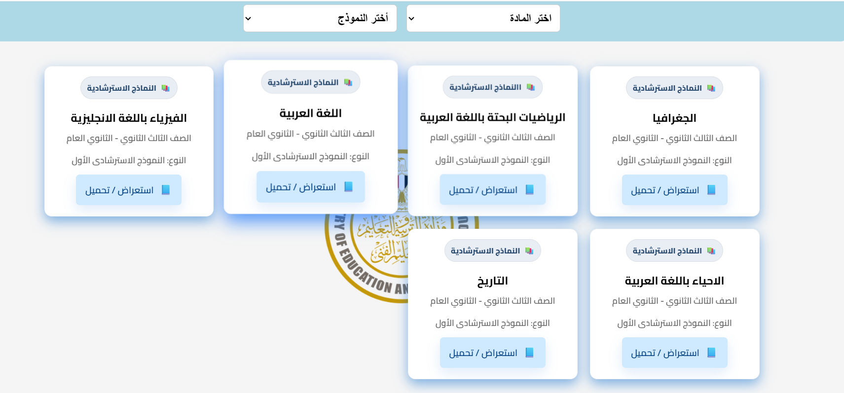 نشر موقع وزارة التربية والتعليم ، النماذج الاسترشادية للصف الثالث الثانوي 2026 وزارة التربية والتعليم في 6 مواد وهي (الجغرافيا - الرياضيات البحتة - اللغة العربية - الفيزياء باللغة الانجليزية - الأحياء باللغة العربية - التاريخ )