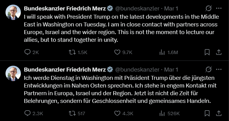 وقال ميرتس في منشور عبر وسائل التواصل الاجتماعي: “سألتقي بالرئيس ترامب في واشنطن يوم الثلاثاء لمناقشة التطورات الأخيرة في الشرق الأوسط. أنا على تواصل وثيق مع شركائنا في أوروبا وإسرائيل والمنطقة. الآن ليس وقت تبادل الاتهامات، بل وقت الوحدة والعمل المشترك”.
