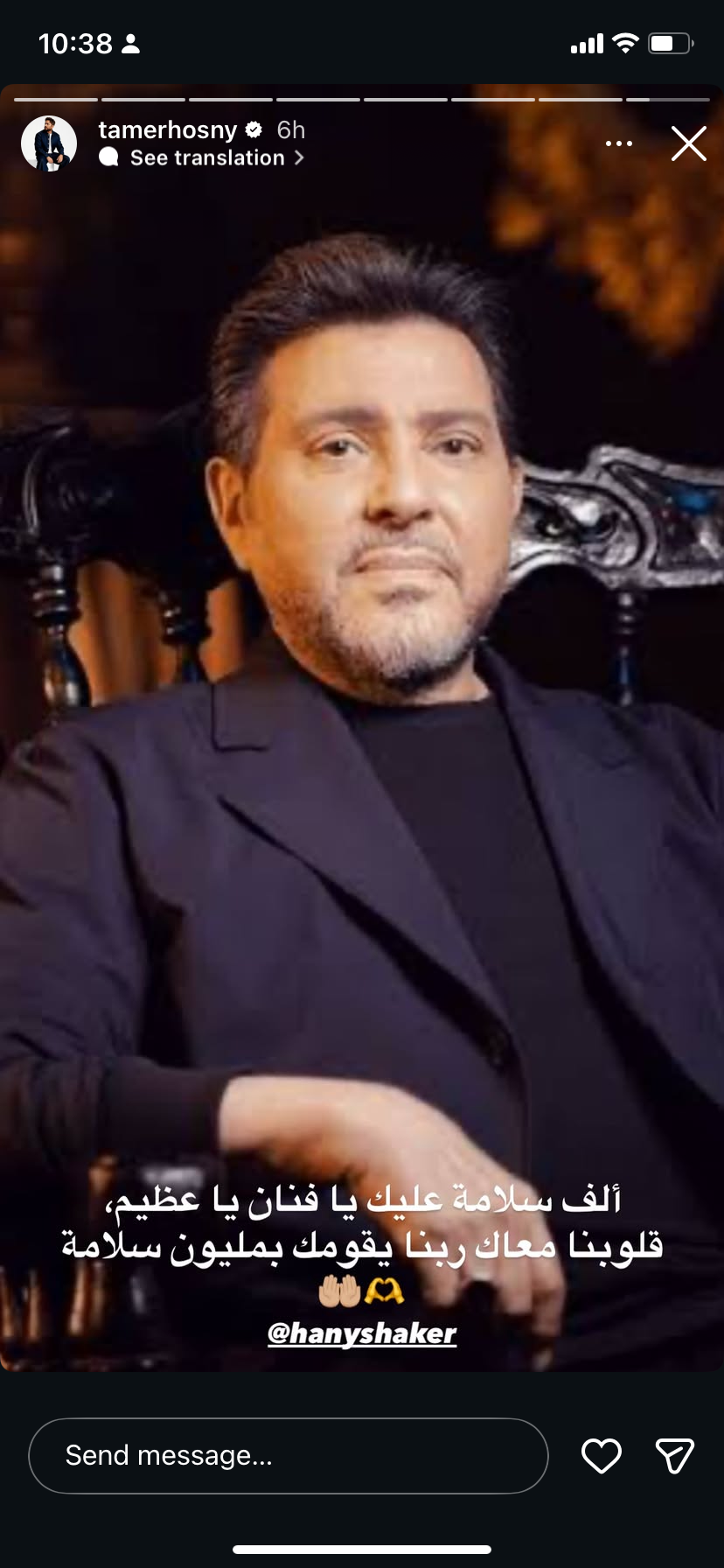 حرص الفنان تامر حسني ، على توجيه رسالة دعم ومساندة لزميله الفنان الكبير هاني شاكر ، حيث نشر عبر حسابه الرسمي على موقع إنستجرام كلمات مؤثرة دعا له فيها بالشفاء العاجل.