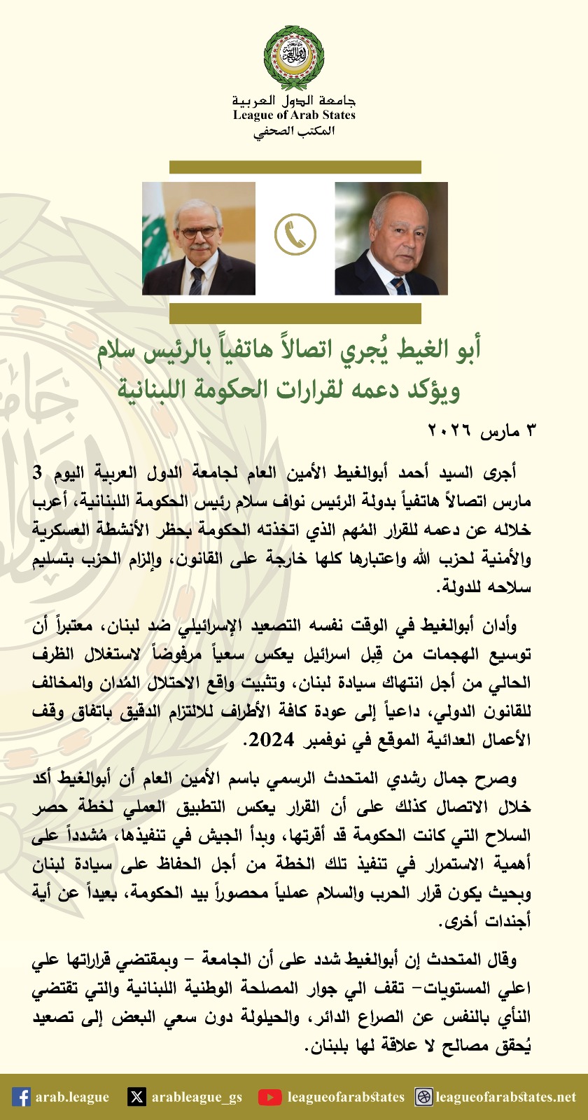أجرى أحمد أبو الغيط الأمين العام لجامعة الدول العربية اليوم 3 مارس اتصالاً هاتفياً بالرئيس نواف سلام رئيس الحكومة اللبنانية، أعرب خلاله عن دعمه للقرار المهم الذي اتخذته الحكومة بحظر الأنشطة العسكرية والأمنية لحزب الله واعتبارها كلها خارجة على القانون، وإلزام الحزب بتسليم سلاحه للدولة.