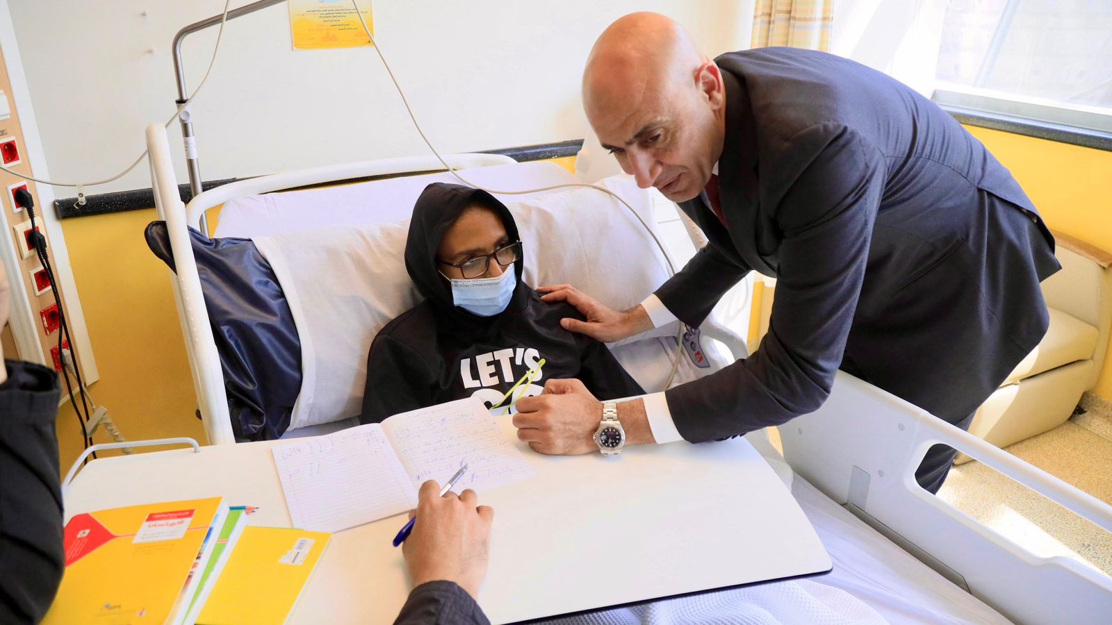 وحرص الوزير على الحديث مع الطلاب، وحثهم على مواصلة التعلم والاجتهاد، مشيدًا بروحهم الإيجابية، ومؤكدًا أنهم أبطال قادرون على تحدي المرض.