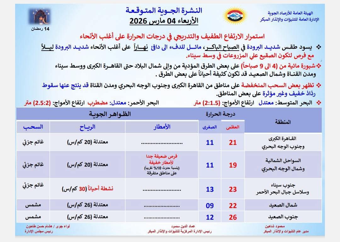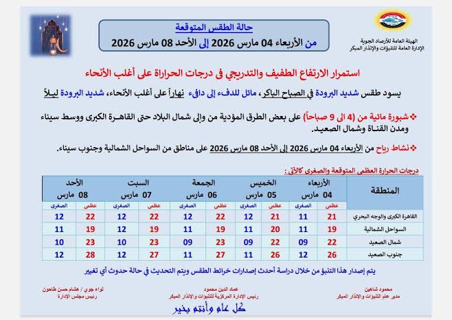 من المتوقع أن يسود طقس مائل للدفء إلى دافئ نهارا على القاهرة الكبرى وعلى الوجه البحري والسواحل الشمالية الغربية، على شمال الصعيد ومائل للدفء على جنوب الصعيد.