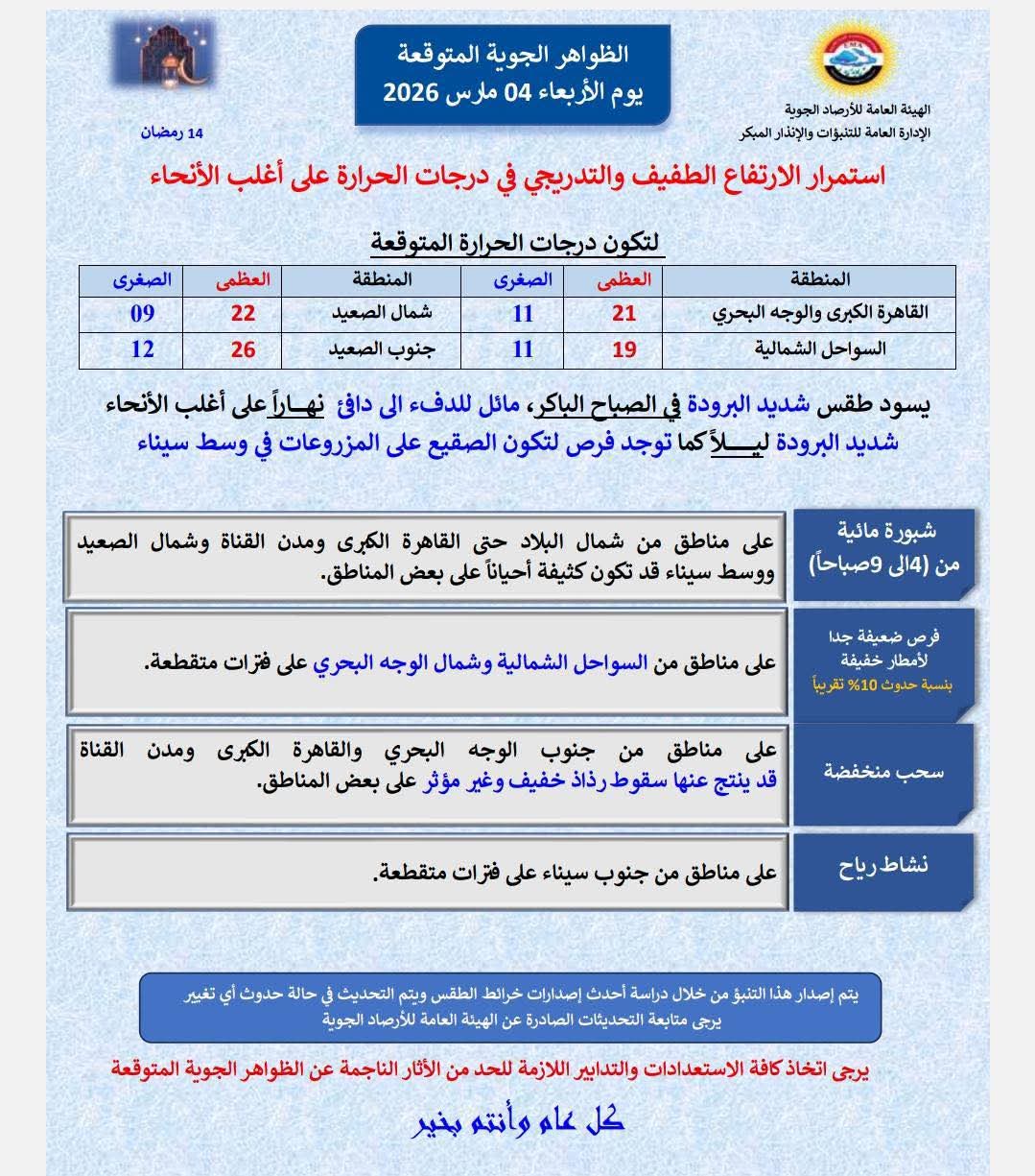 كما توقعت هيئة الأرصاد الجوية أن يسود طقس بارد إلى شديد البرودة فى آخر الليل، وفى الصباح الباكر على شمال البلاد والقاهرة الكبرى وعلى شمال الصعيد ووسط سيناء وأغلب الأنحاء.