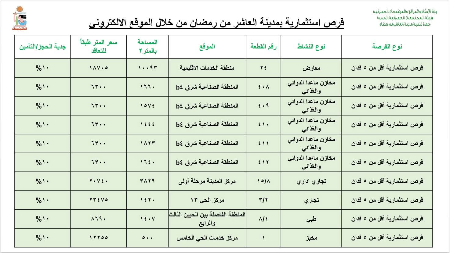 أعلن جهاز تنمية مدينة العاشر من رمضان، برئاسة المهندس علاء عبد اللاه مصطفى رئيس الجهاز والمشرف على جهاز حدائق العاشر، عن طرح عدد من الفرص الاستثمارية الجديدة لشهر مارس ٢٠٢٦.