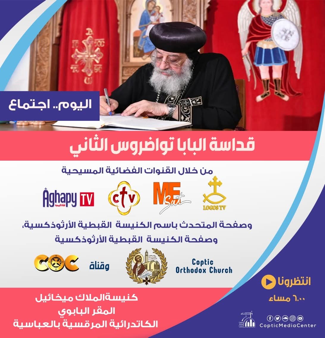 يلقي، اليوم، قداسة البابا تواضروس الثاني، بابا الإسكندرية وبطريرك الكرازة المرقسية كلمة روحية جديدة، ضمن اللقاءات الدورية التي يحرص قداسته على تقديمها للشعب، من كنيسة الملاك ميخائيل بالمقر البابوي بالكاتدرائية المرقسية بالعباسية.