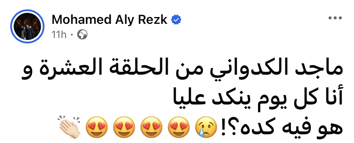 وكتب محمد رزق عبر حسابه الشخصي بموقع فيسبوك: "ماجد الكدواني من الحلقة العشرة و أنا كل يوم ينكد عليا هو فيه كده".