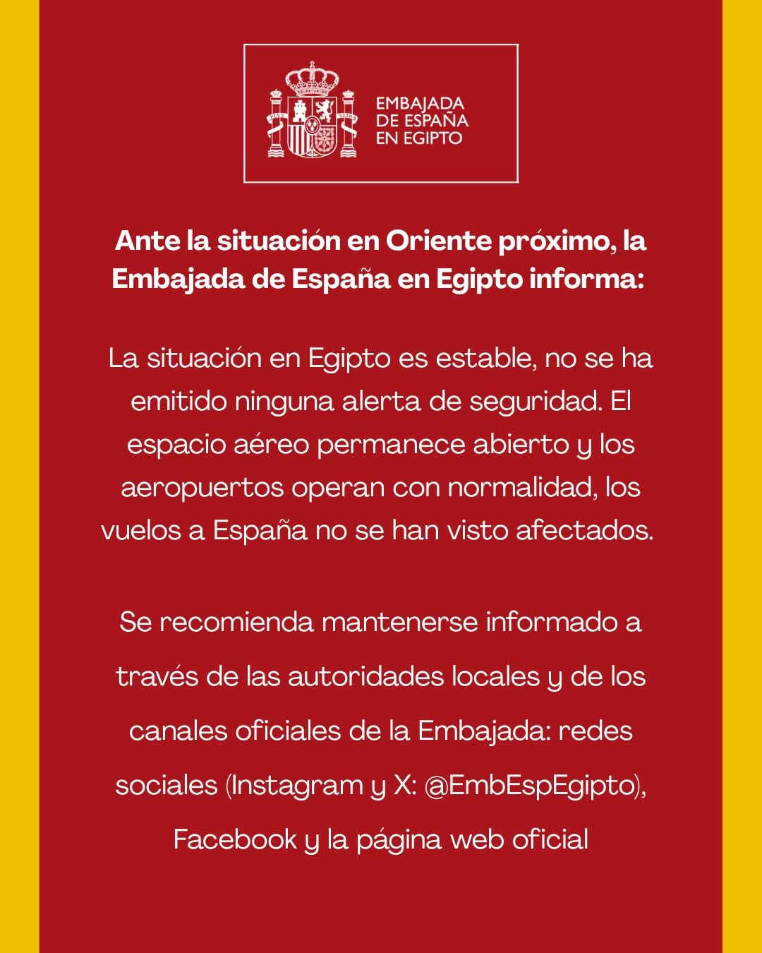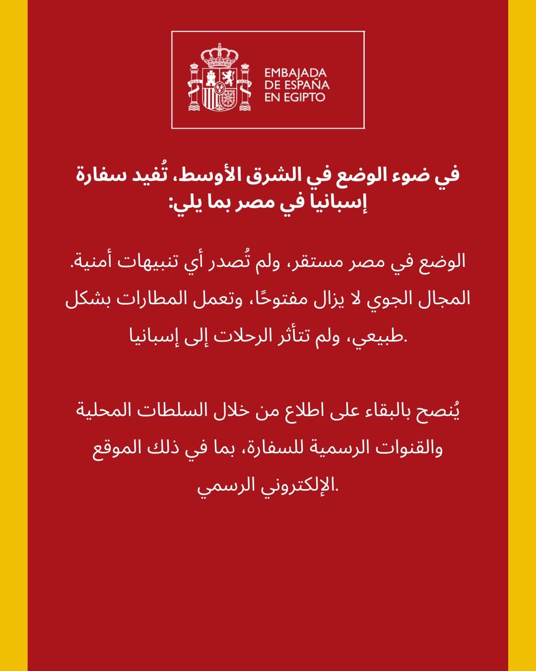 أصدرت سفارة إسبانيا في مصر بيانًا باللغتين الإسبانية والعربية، بشأن تطورات الأوضاع في منطقة الشرق الأوسط، أكدت فيه أن الأوضاع داخل مصر مستقرة، ولم يتم إصدار أي تنبيهات أمنية حتى الآن.