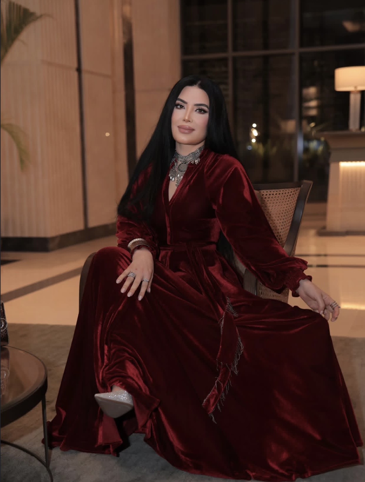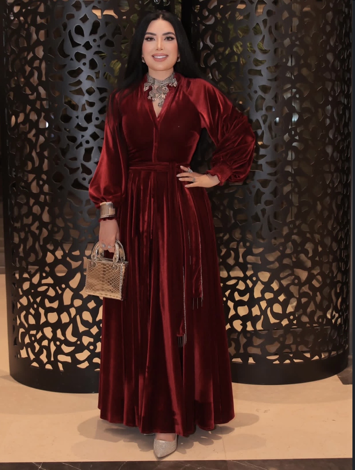 وارتدت عبير قفطان طويل باللون الأحمر النبيتي، تميز بقصة واسعة وأكمام منفوخة، مع حزام عند الخصر أبرز رشاقتها ومنح الإطلالة طابعا راقيا.