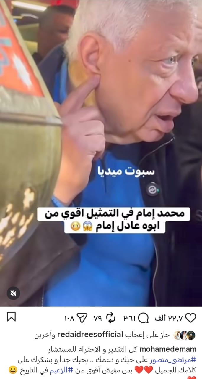 وعلّق محمد إمام على الفيديو قائلًا: "كل التقدير والاحترام للمستشار مرتضى منصور على حبك ودعمك.. بحبك جدًا وبشكرك على كلامك الجميل، بس مفيش أقوى من الزعيم في التاريخ".