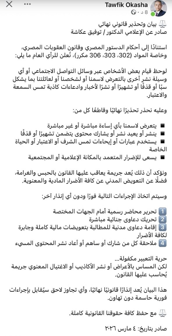 وأوضح "عكاشة" في بيانه الذي نشر عبر حسابه الرسمي على فيس بوك، أنه لوحظ في الآونة الأخيرة قيام بعض الأشخاص عبر وسائل التواصل الاجتماعي أو من خلال أي وسيلة نشر أخرى، بالتعرض لاسمه أو لشخصه أو لأسرته، بما يشكل سبًا أو قذفًا أو تشهيرًا أو نشرًا لأخبار وادعاءات كاذبة تمس السمعة والاعتبار.