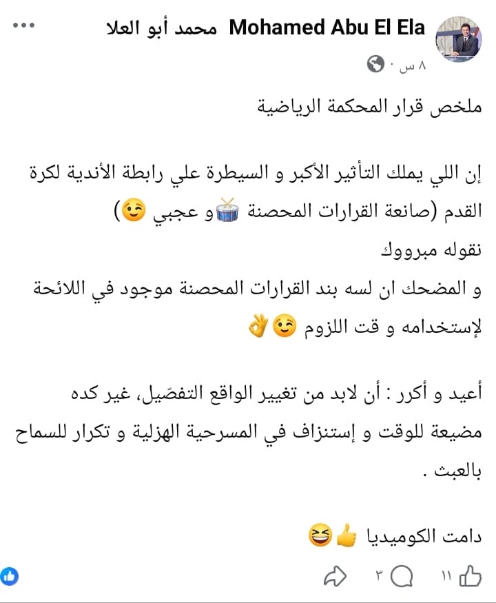 وكتب ابو العلا، عبر حسابه على "فيسبوك" ملخص قرار المحكمة الرياضية: "الذي يملك التأثير الأكبر والسيطرة على رابطة الأندية لكرة القدم (صانعة القرارات المحصنة (وعجبي)، نقول له: مبروك والمضحك أن بند القرارات المحصنة لا يزال موجودًا في اللائحة لاستخدامه عند اللزوم.