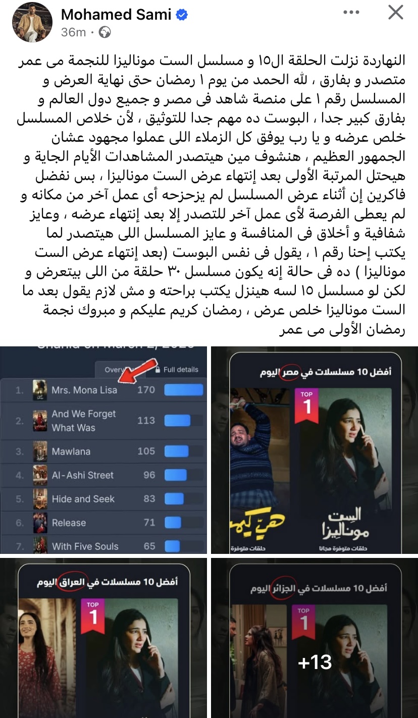 وكتب محمد سامي عبر حسابه علي موقع التواصل الإجتماعي فيسبوك:"النهاردة نزلت الحلقة ال١٥ و مسلسل الست موناليزا للنجمة مى عمر متصدر و بفارق ، لله الحمد من يوم ١ رمضان حتى نهاية العرض و المسلسل رقم ١ على منصة شاهد فى مصر و جميع دول العالم و بفارق كبير جدا ، البوست ده مهم جدا للتوثيق ، لأن خلاص المسلسل خلص عرضه و يا رب يوفق كل الزملاء اللى عملوا مجهود عشان الجمهور العظيم ، هنشوف مين هيتصدر المشاهدات الأيام الجاية و هيحتل المرتبة الأولى بعد إنتهاء عرض الست موناليزا ، بس نفضل فاكرين إن أثناء عرض المسلسل لم يزحزحه أى عمل آخر من مكانه و لم يعطى الفرصة لأى عمل آخر للتصدر إلا بعد إنتهاء عرضه ، وعايز شفافية و أخلاق فى المنافسة