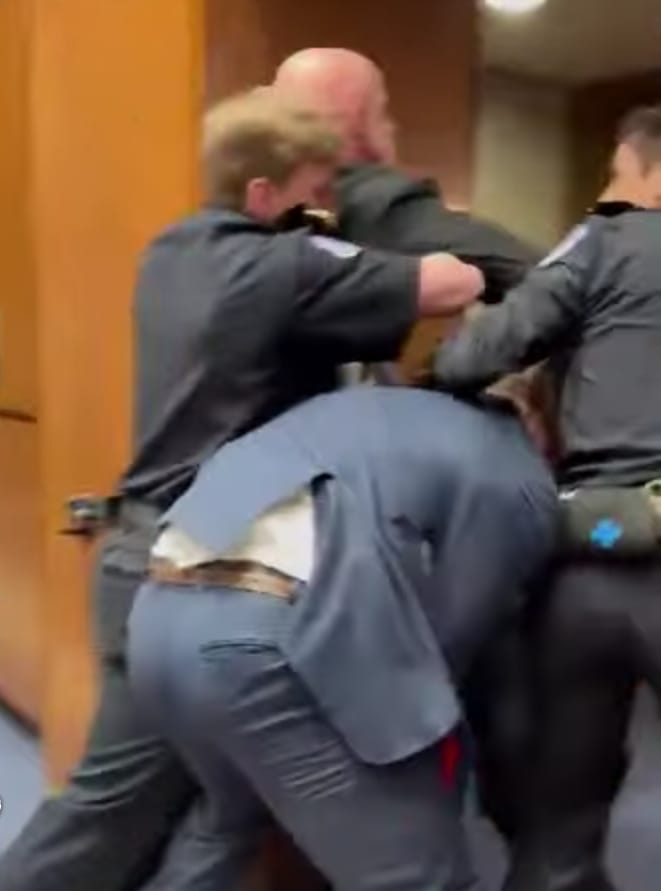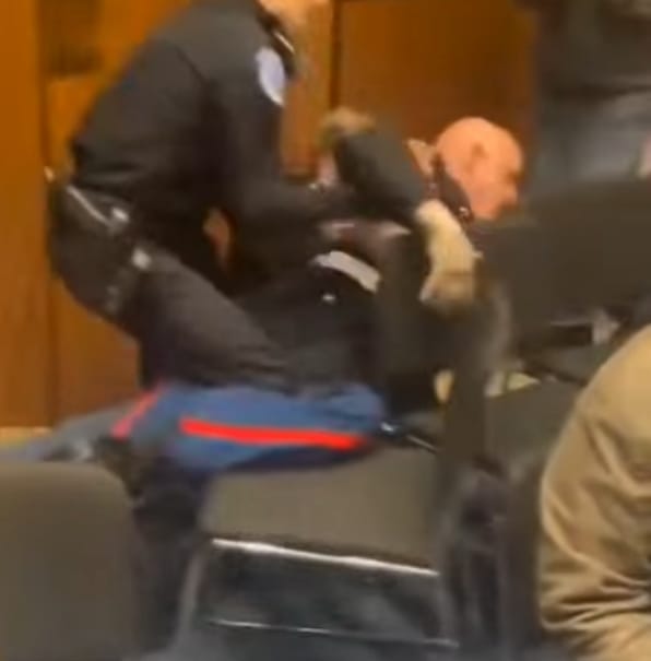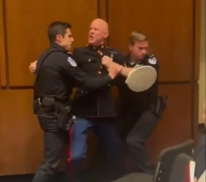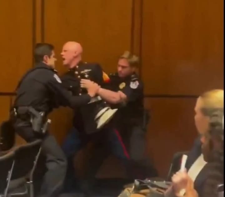 تداول رواد مواقع التواصل الاجتماعي مقطع فيديو يُظهر رقيب سابق في البحرية الأمريكية وهو يصرخ معترضا على اندلاع حرب بين الولايات المتحدة وإيران، قبل أن يتدخل الأمن ويقوم بإخراجه بالقوة من قاعة جلسة استماع داخل مجلس الشيوخ.