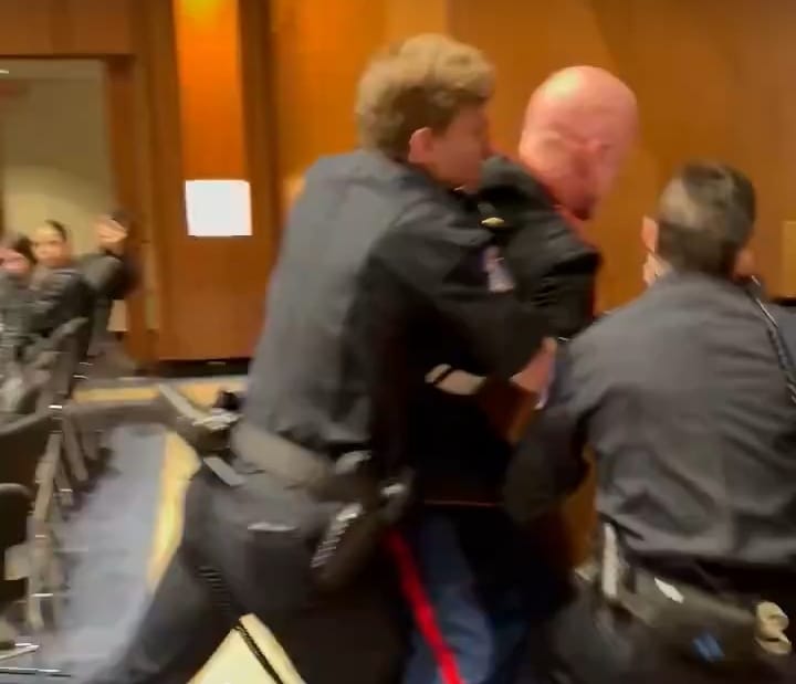 وأظهر مقطع الفيديو خلال عملية إخراج جندي المارينز، وهو يصرخ قائلًا: أمريكا لا تريد إرسال أبنائها وبناتها إلى الحرب من أجل إسرائيل، وخلال التدافع بدت يده اليسرى عالقة بين الباب، وسمع يقول إن ذراعه اليسرى تعرضت للكسر.